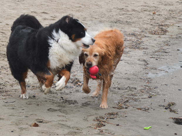 Bella doesn't like to swim, but she loves to chase after Bailey.
